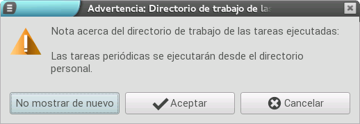 En caso de querer almacenar la tarea como plantilla, para utilizarla como base en otras creaciones, tenemos que pulsar el botón Añadir como plantilla. Por el contrario, si pulsamos el botón Añadir, se muestra una ventana que nos avisa del directorio de trabajo de la aplicación, el cual es el directorio personal del usuario. Podemos pulsar el botón Aceptar para continuar o el de No mostrar de nuevo para continuar y que no vuelva a mostrar el mensaje.