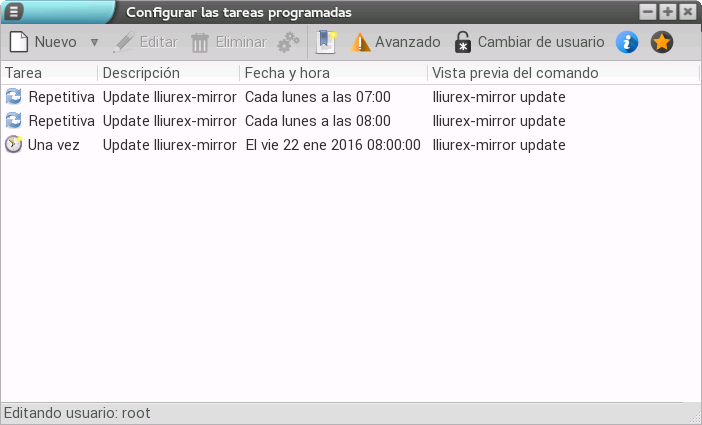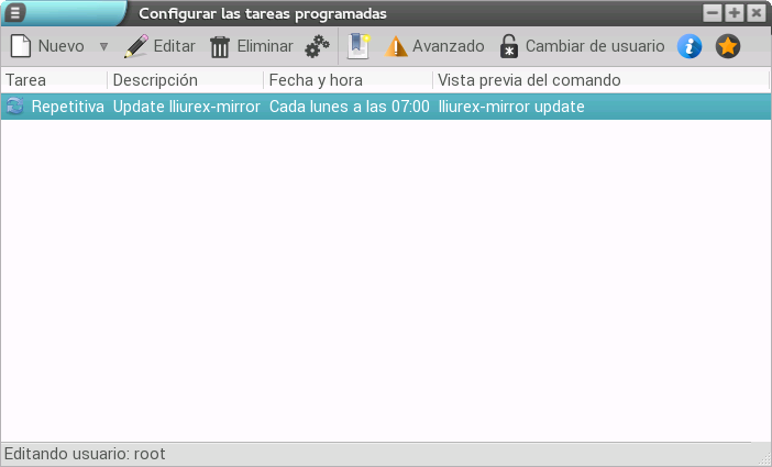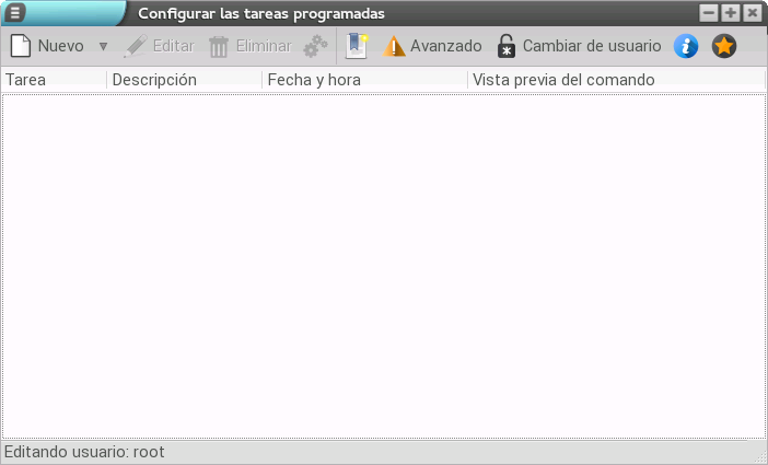 Además, y en caso de ejecutarlo como administrador, en la parte inferior de la ventana se indicará que se está editando como root y, en la parte superior, se añade una nueva funcionalidad llamada Cambiar de usuario que nos permite seleccionar un usuario para cambiar sus tareas.