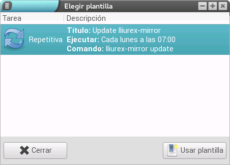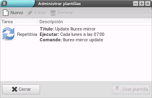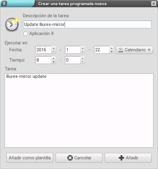 En ocasiones, es interesante la ejecución de determinadas acciones que pueden ayudar al trabajo del día a día del usuario. Tareas como la actualización de la réplica de lliurex (interesante para disponer de todas las actualizaciones y nuevas herramientas que van surgiendo), el apagado automático de los clientes y otras que pueden ser automatizadas, son propicias para ser configuradas en el planificador como tareas programadas. Es importante señalar que la aplicación está orientada a administradores y a usuarios con un cierto nivel de conocimientos de comandos, ya que muchas de las tareas automatizadas requieren la ejecución de scripts con diferentes órdenes.