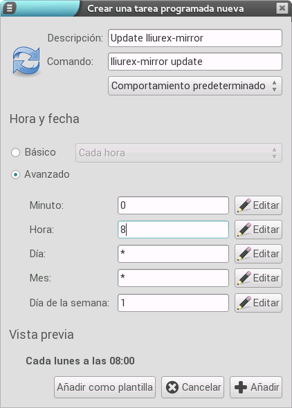 Como ejemplo, vamos a poner uno similar al anterior, en el que programaremos una actualización del mirror para un día a las 8 de la mañana: