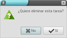 También es posible que necesitemos eliminar alguna tarea creada, para lo que debemos pulsar el botón Eliminar. Inmediatamente se muestra una ventana para confirmar el borrado en la que debemos pulsar el botón Sí, lo que hace que se elimine la tarea seleccionada.