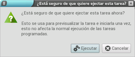 Otra operación que nos permite realizar la aplicación, es la ejecución inmediata de alguna de las tareas programadas. Para ello pulsamos el botón Ejecutar la tarea seleccionada (las ruedas dentadas) y se muestra una ventana que permite confirmar la ejecución. Pulsando el botón Ejecutar la tarea se inicia.