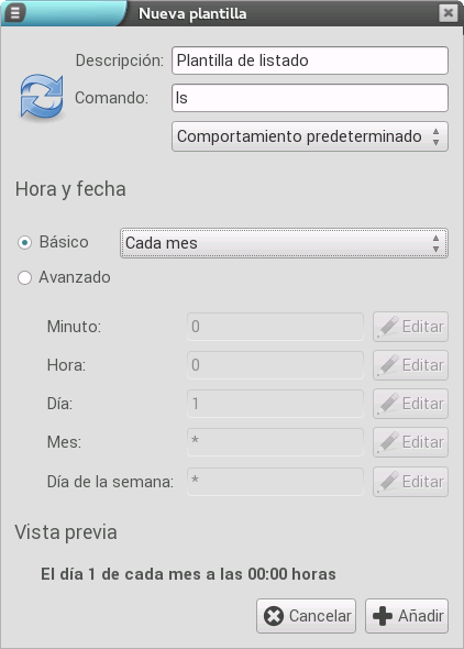 - Básico: permite fijar la periodicidad de manera sencilla (cada hora, día, semana, etc).