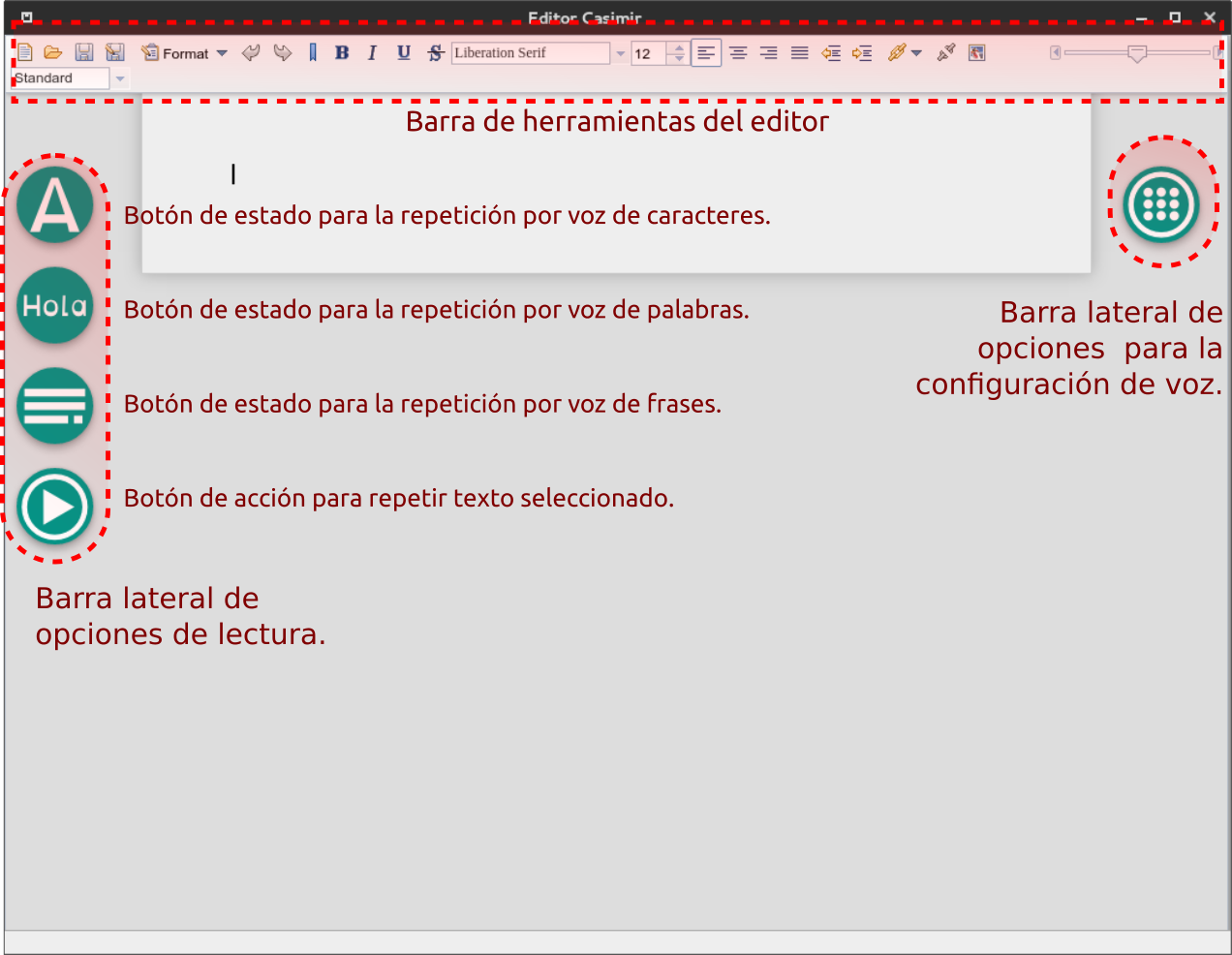 - La barra lateral izquierda con cuatro botones. Los tres primeros, botones de estado, que sirven para indicar que deseamos que se repitan los carácteres a medida que escribimos, las palabras o las frases. Además, disponemos de un botón de acción para poder leer el texto que tengamos seleccionado en un momento dado.