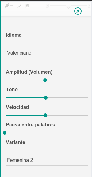 - El botón de opciones a la parte derecha, que nos permite escoger diferentes opciones del sintetitzador de voz, como el idioma, el volumen, el tono, la velocidad, la pausa entre palabras, o la variant de la voz, pudiendo escuchar diferentes voces femeninas, masculinas o con efectos.