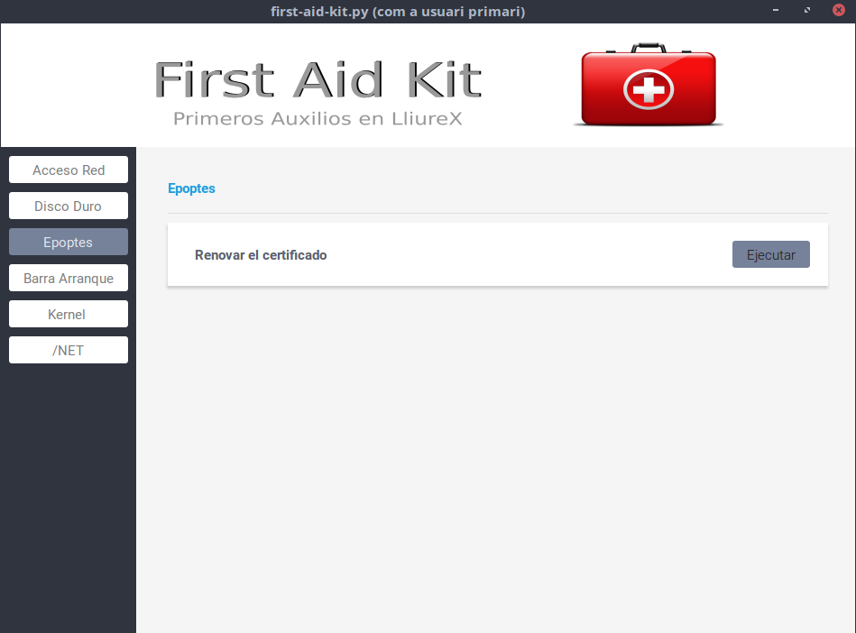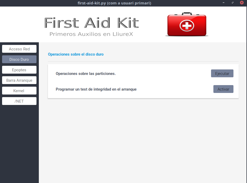 First Aid kit es un pequeño programa de ayuda al usuario Administrador, para que de una manera sencilla pueda resolver los problemas comunes que te puedes encontrar en LliureX.
