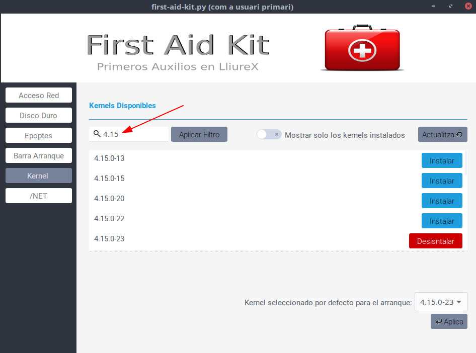 En la parte principal tenemos el listado de los kernels disponibles pero podemos filtrar el listado añadiendo un patron a la caja de texto y aplicando el filtro.