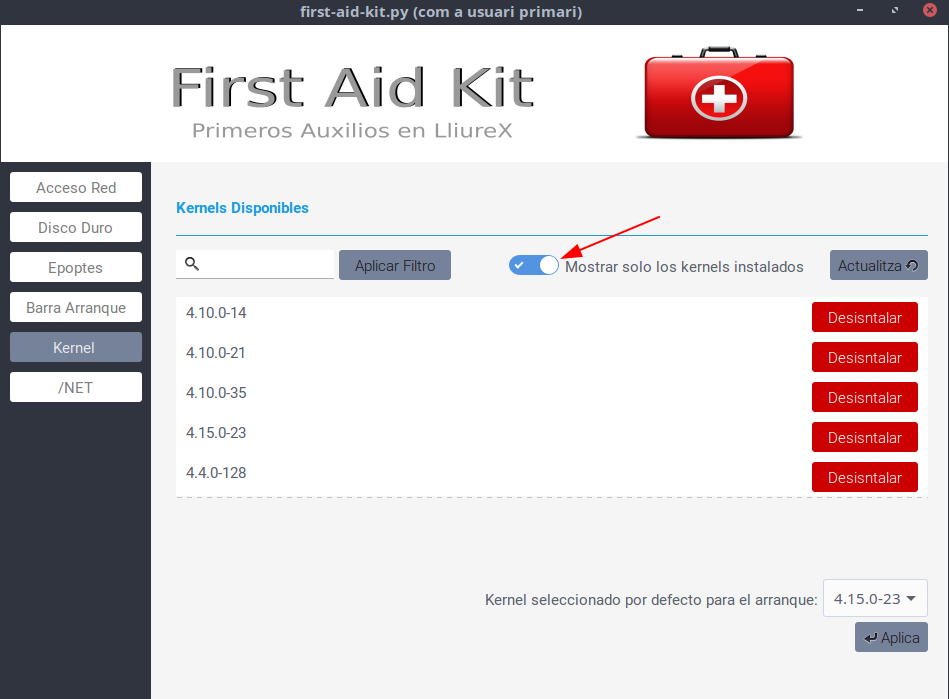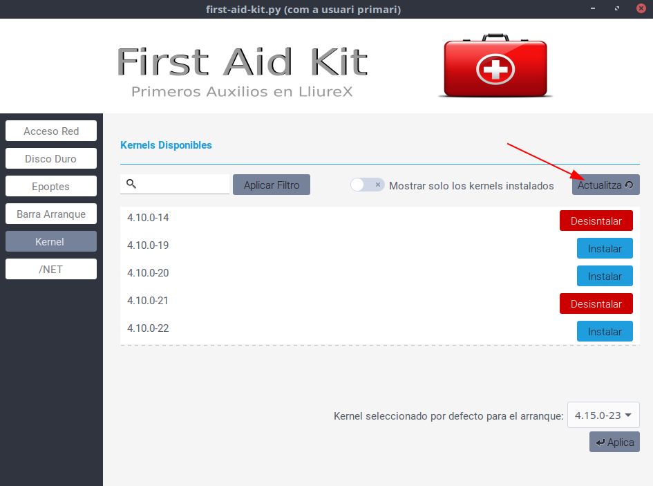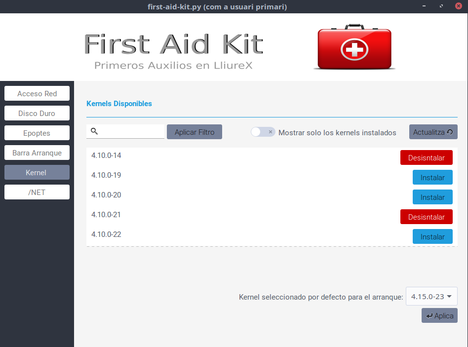 First Aid kit es un pequeño programa de ayuda al usuario Administrador, para que de una manera sencilla pueda resolver los problemas comunes que te puedes encontrar en LliureX.