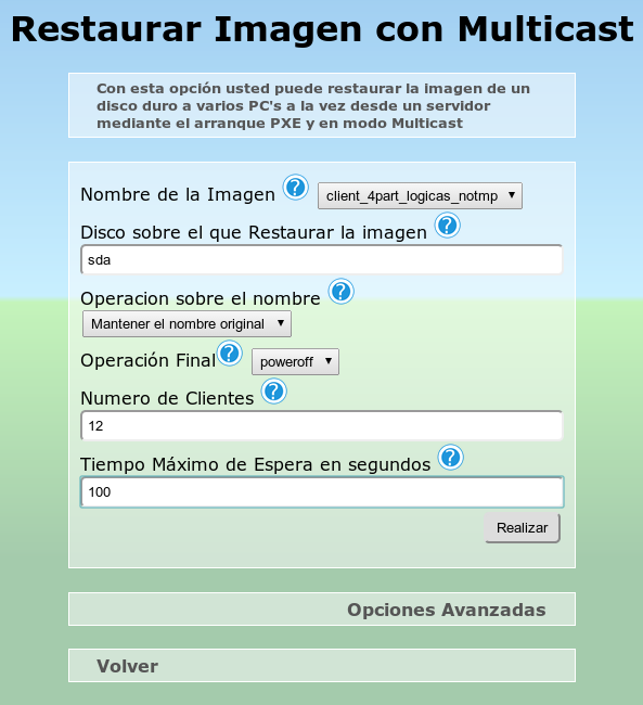 Cuando seleccionamos esta opción lo que pretendemos es que una imagen creada anteriormente y guardada en el servidor sea restaurada sobre mas de un equipo a la vez, optimizando así al máximo los recursos que nos ofrece el aula en base a la red, servidor y maquinas a restaurar.
