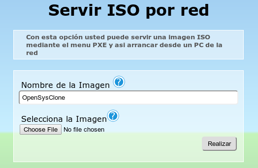 Esta opción la utilizaremos para poder servir por PXE imágenes ISO, y solo es funcional cuando el Open-Sysclone se ejecuta en el propio servidor. Si lo hacemos desde una maquina remota esta opción estará deshabilitada.