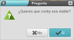 Tras pinchar en el banner la primera pregunta que se nos formula es si queremos tener Conky en el escritorio o no. La respuesta que damos es permanente en el sistema, es decir, que en los sucesivos arranques éste se comportará tal y como lo hemos definido anteriormente. Obviamente si en algun momento queremos cambiar la opción podemos modificarla de nuevo accediendo a la aplicación.