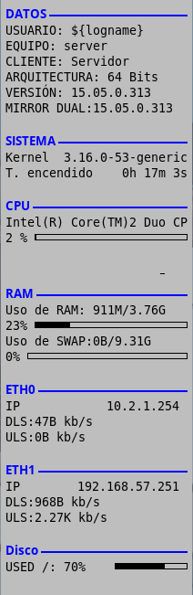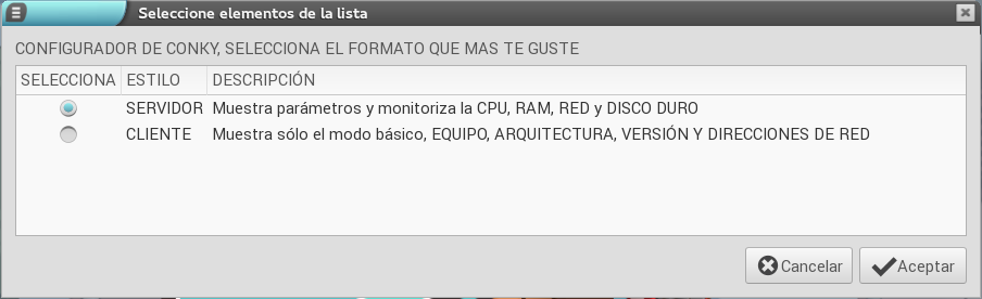 Para mostrarlo en el escritorio pulsamos el botón Sí. A continuación se muestra un diálogo donde seleccionamos el formato del applet de Conky: la version de servidor (con múltiples datos sobre el sistema) o la versión de cliente (con menos datos pero con los más relevantes).