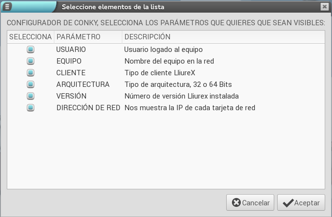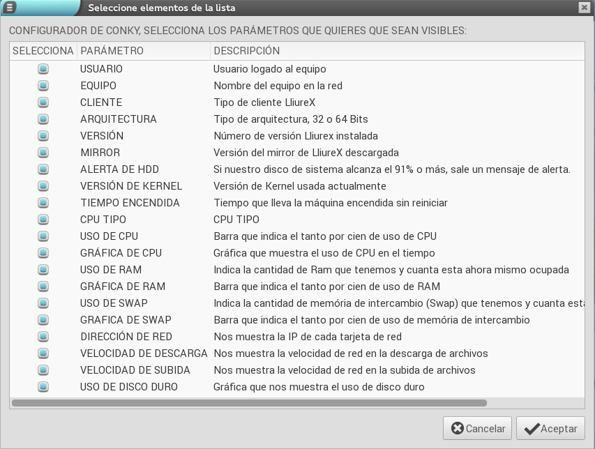 En la primera versión de LliureX 15.05, éste llevaba, por defecto, un applet en el escritorio con varios indicadores. El applet era fijo y único según se ejecutara un servidor u otro tipo de cliente. Por ello, y para que fuera el usuario quien eligiera tanto el mejor applet para Conky como el número de datos que se muestran, se añadieron nuevas funcionalidades.