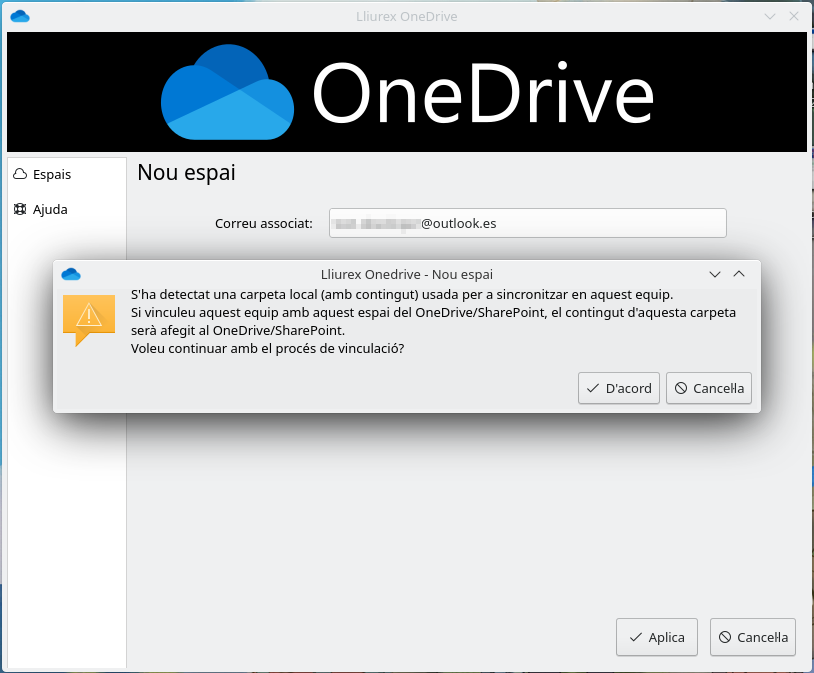 Si a la hora de vincular el equipo LliureX-OneDrive detecta que ya existe una carpeta OneDrive con contendido se mostrará el siguiente mensaje:
