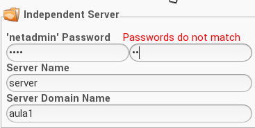 En el campo netadmin se requiere que escriba por duplicado la clave de administrador de red. Esta clave no tiene por qué coincidir con la clave del administrador del sistema, puede ser diferente. Se recomienda que para realizar tareas de administración del aula se utilice el usuario netadmin una vez finalizada la inicialización del servidor. Si al introducir la clave por duplicado no coincidieran ambas claves el sistema avisa marcando la segunda en rojo.