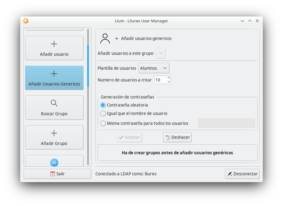 A la hora de crear usuarios de forma automática podemos hacerlo mediante Llum y la opción de "añadir usuarios genéricos".