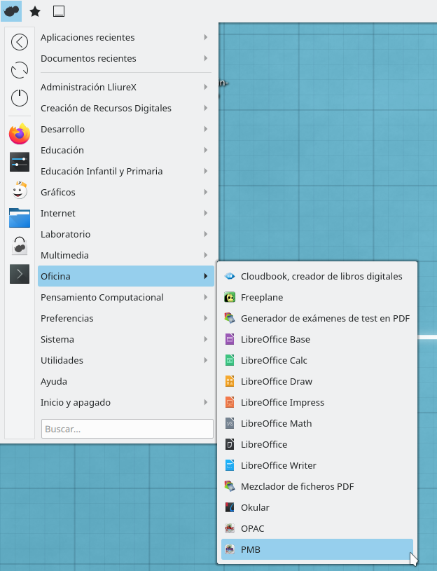 Una vez PMB la aplicación, ésta está disponible en el menú: Aplicaciones -> Oficina -> PMB (el aspecto de este menú puede variar en función de la versión de LliureX y/o de la personalización realizada por el usuario)