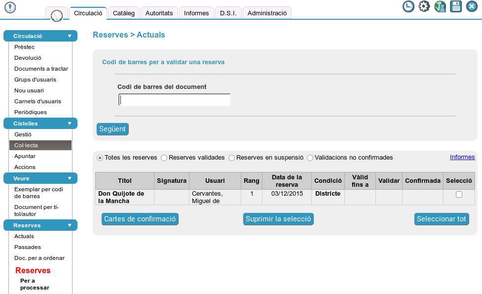 El submenú Circulació conté les operacions principals que es poden realitzar, entre les quals tenim les següents: