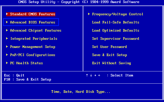 Llegado este punto debemos buscar una opción del tipo Boot o Advanced BIOS Features (la opción recuadrada en la figura anterior) y seleccionarla, desplazándose con las teclas direccionales del teclado y presionando la tecla Intro. Una vez dentro de este submenú debemos buscar una opción del tipo Boot Sequence o Boot Device Select.