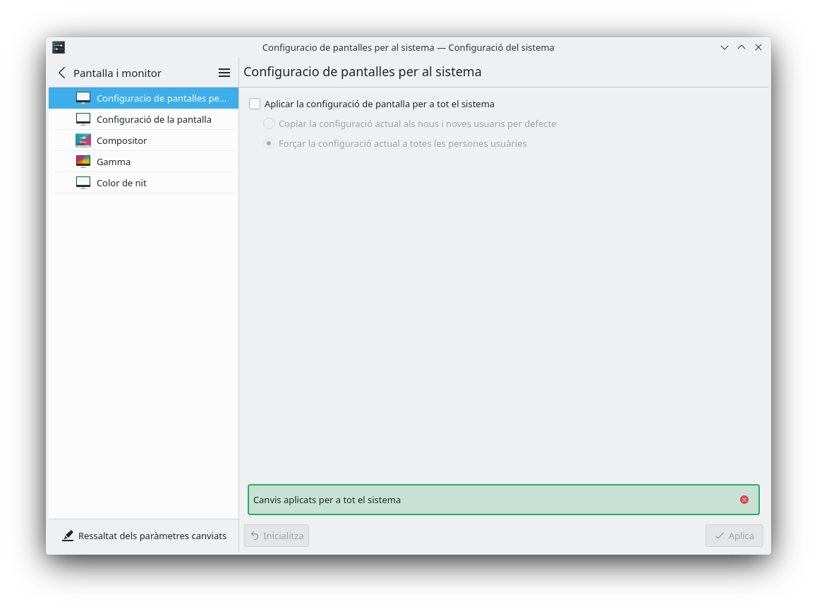 Una vegada establida la configuració si es desitja replicar a tots els usuaris del sistema s'accedirà a l'opció Configuració de pantalles del sistema que es troba en Inici>Preferències>Preferències del sistema>Pantalla i monitor