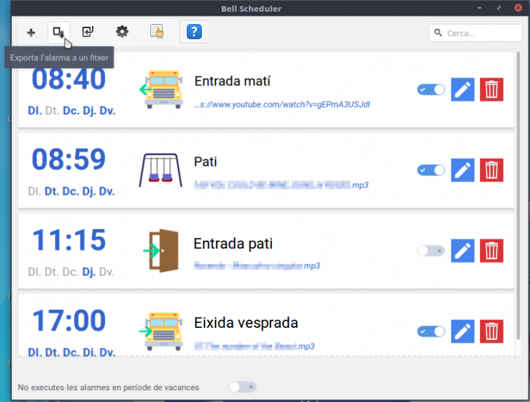 El Bell Scheduler permet crear alarmes, importar una llista d'alarmes prèviament creada o guardar la llista d'alarmes que s'hagen creat.