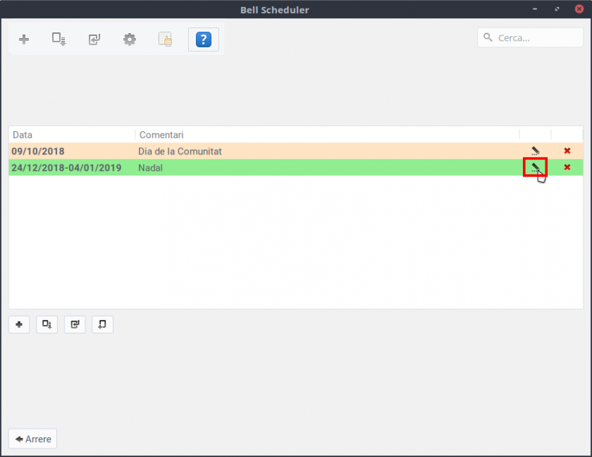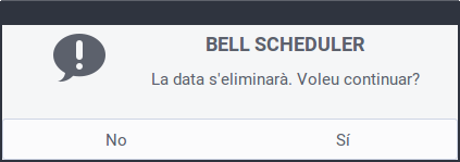 Des de l'aplicació Taskscheduler és possible consultar les dades de les alarmes i desactivar-les. Per a això, cal fer clic sobre el botó corresponent. Cal indicar que l'acció d'eliminar des del Taskscheduler NO IMPLICA que l'alarma s'elimine del Bell Scheduler. NOMÉS suposa la desactivació de l'alarma.