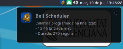 Cuando una alarma programada comienza a ejecutarse se muestra una notificación (durante aproximádamente 10 segundos) con la información básica de la misma: hora, nombre y duración de la misma. Al mismo tiempo aparece un icono en la barra de menú