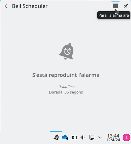Fent clic sobre el botó Para ara és possible cancel·lar la reproducció de l'alarma. També és possible cancel·lar la reproducció fent clic amb el botó dret del ratolí sobre la icona de la barra de ferramentes.