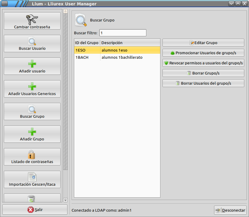 En la figura siguiente se ha introducido en el campo Buscar filtro el 1 y, al haber coincidencias con grupos activos en el sistema, muestra los diferentes grupos que contienen dicho campo. Si seleccionamos el grupo deseado, se activarán las opciones de gestión disponibles: Editar Grupo, Promocionar Usuarios de grupo/s, Borrar Grupo/s y Borrar Usuarios del grupo/s.