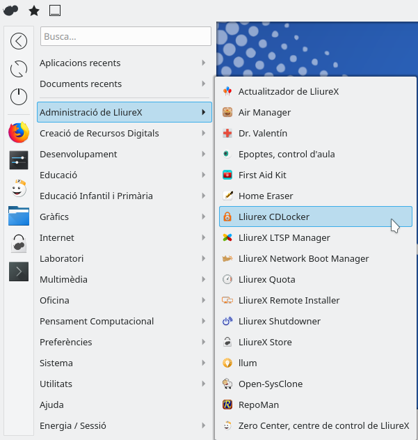 L'accés a CD Locker pot realitzar-se a través del menú del sistema dins de l'apartat  Administració de LliureX.
