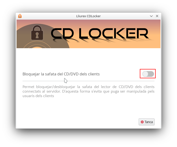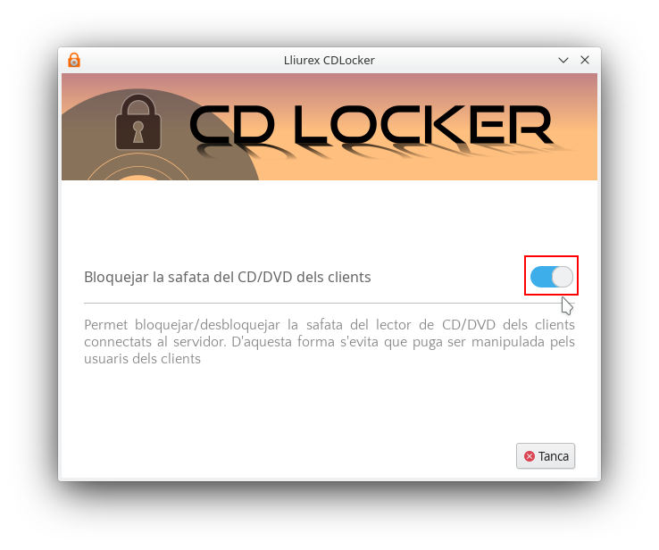 En LliureX 16 i LliureX 19 hi ha disponible una eina denominada CD Locker que permet bloquejar des del servidor de l'aula la safata del lector del CD/DVD dels equips clients connectats al servidor. D'aquesta manera s'evita que aquesta siga manipulada quan no siga necessari l'ús del lector de CD/DVD.Center.