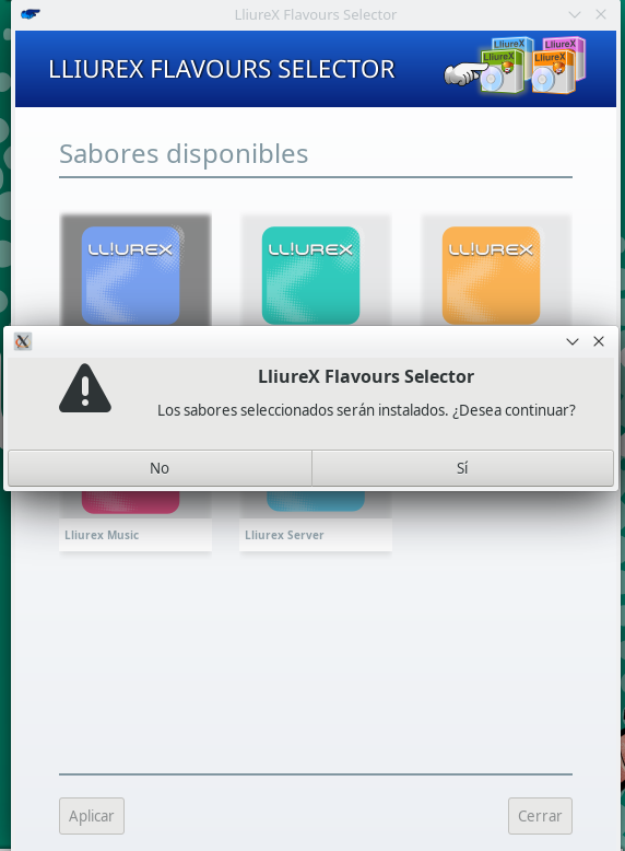 Antes de iniciarse la instalación del sabor o sabores seleccionados se mostrará un mensaje para poder confirmar la instalación.