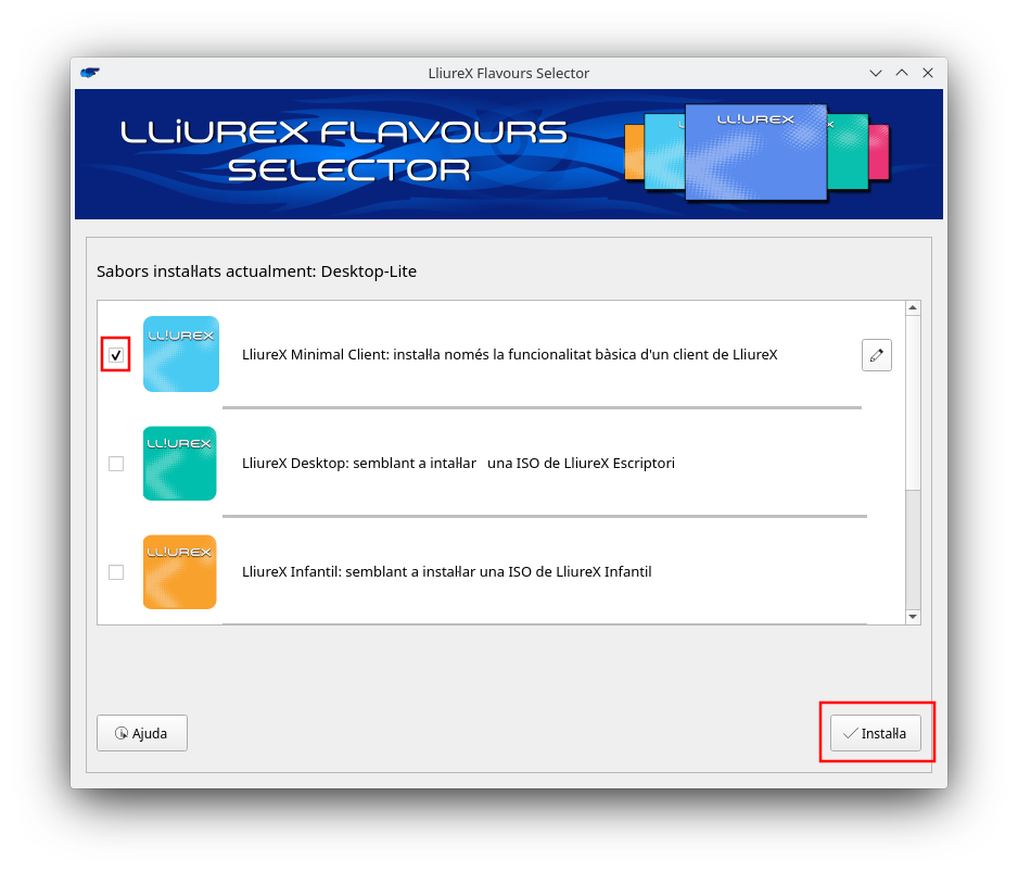 - Escriptori Lite: equival a instal·lar una ISO d'Escrpitori-Lite de Lliurex (similar a l'escriptori complet però sense les aplicacions educatives). En aquest cas, als metapaquets ja instal·lats en el sistema s'afig el metapaquet lliurex-meta-desktop-lite