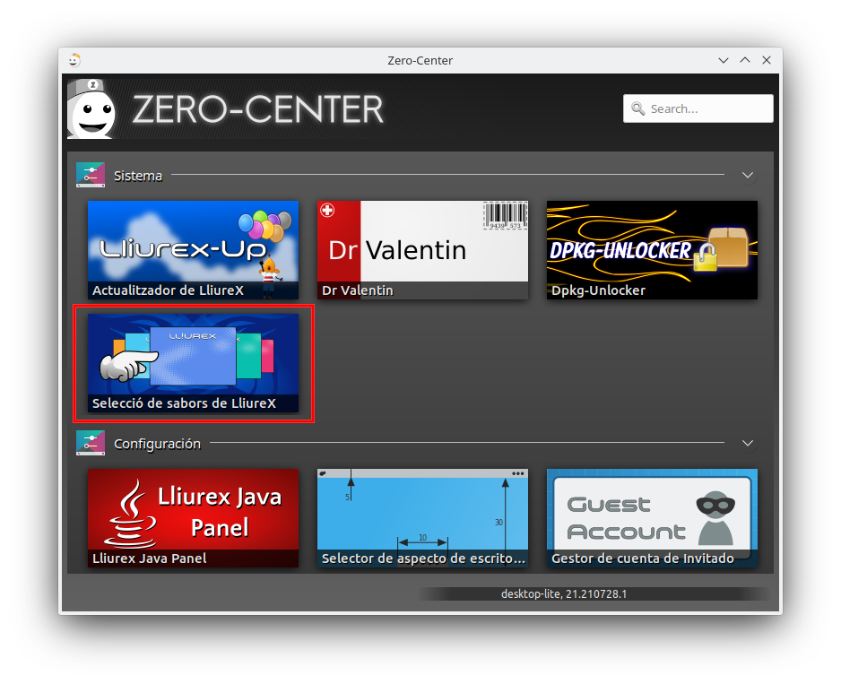 Una vegada iniciat el Zero Center hem d'anar a Selector de sabors: