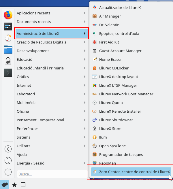 Per tal d'iniciar l'assistent de sabors hem d'anar a Inici > Administració de LliureX > Zero Center i hi hem de seleccionar el sabor que necessitem: