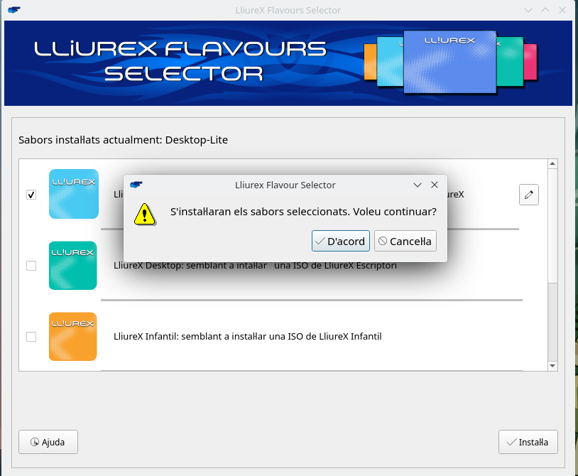 En el cas que es puga instal·lar el sabor Escriptori, quan es faça clic al botó Aplica, es mostrarà una finestra on es podrà configurar quin tipus d'escriptori s'instal·larà.