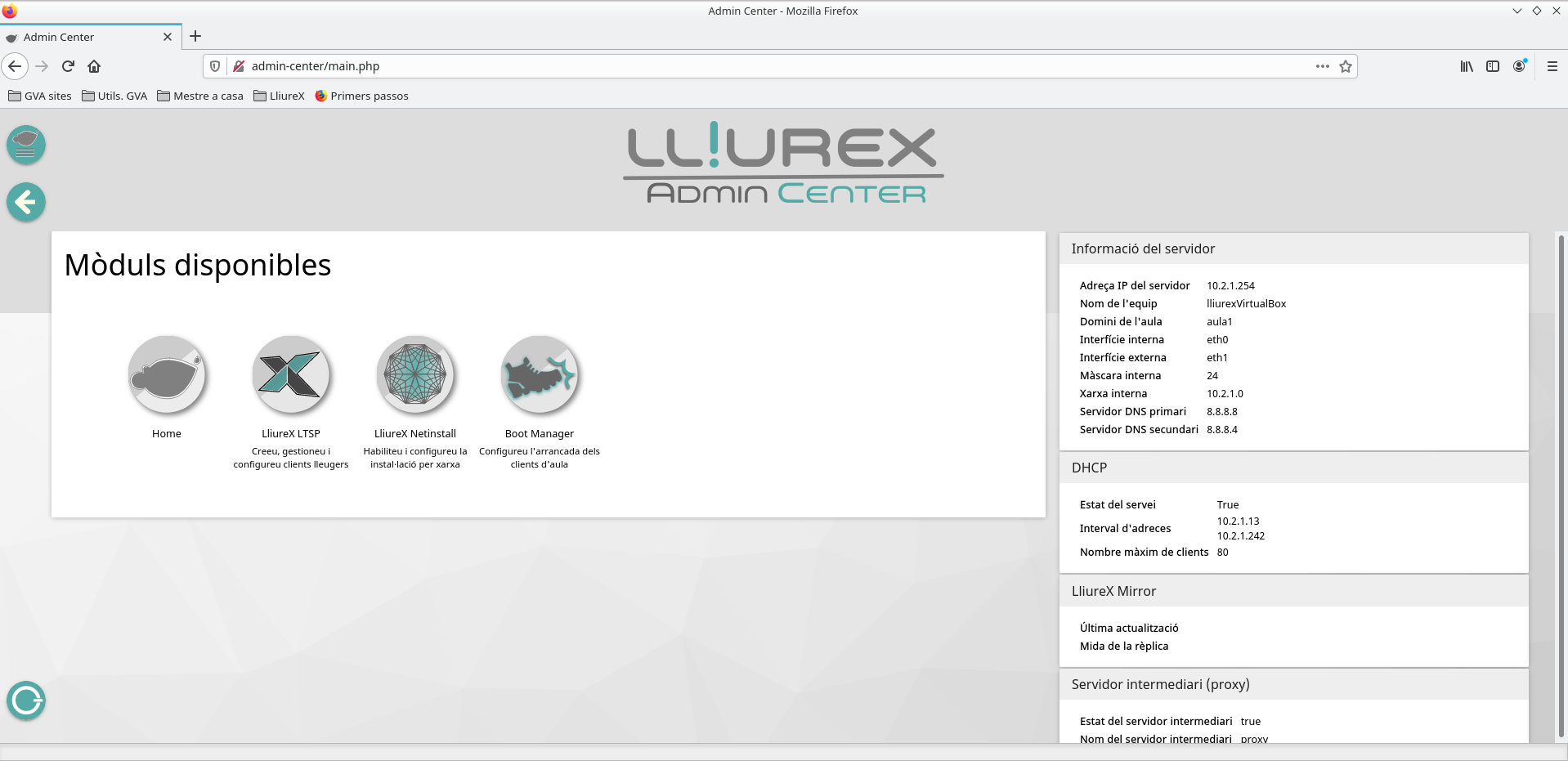La gestión del servidor puede realizarse a través del Centro de administración, más conocido como admincenter. Se trata de una aplicación web accesible desde cualquier parte del centro. Para acceder hay que escribir sobre la barra del navegador localhost.