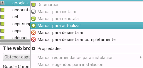 Como hemos comentado en la introducción, los repositorios contienen las últimas versiones de los programas, por lo que en caso de haber una actualización, éstas se suben directamente de modo que quedan disponibles para toda la comunidad. Por ello, puede ocurrir que alguno de los programas indique que tiene una actualización (estado en verde con un símbolo de exclamación). Para actualizarlo, tenemos que: seleccionar el paquete, hacer clic con el botón derecho del ratón y selecionar la opción Marcar para actualizar.