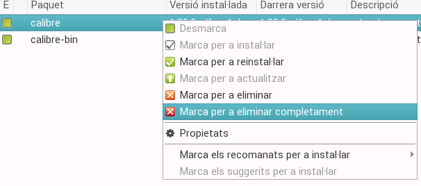 També podem, com en el cas anterior, desinstal·lar una aplicació de manera semblant a la instal·lació. Per a això, seleccionem el paquet i fem clic amb el botó dret del ratolí, seleccionant l'opció Marca per a eliminar (si volem eliminar l'aplicació) o Marca per a eliminar completament (si volem que, a més, elimine els fitxers de configuració de l'aplicació). Es recomana usar la segona opció.