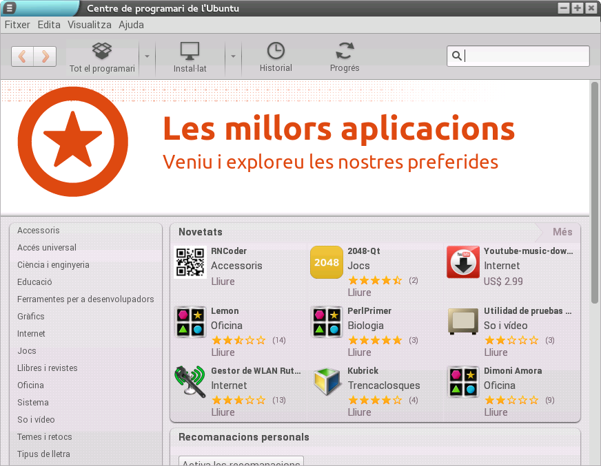 Aquesta aplicació és la forma més senzilla d'Ubuntu per a instal·lar o eliminar programes. Per a accedir-hi hem d'obrir el menú Aplicacions -> Instal·lació de programari.