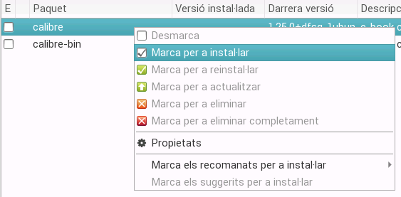 En el nostre cas, com que els paquets de la imatge superior no estan instal·lats, podem instal·lar-los fent clic, amb el botó dret del ratolí, i seleccionant l'opció Marca per a instal·lar.