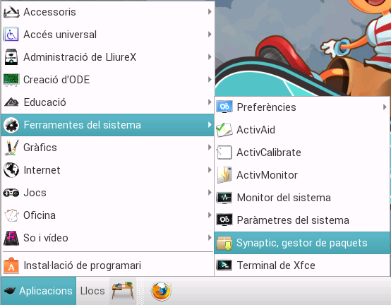 Per a accedir-hi hem d'obrir el menú Aplicacions -> Eines del sistema -> Synaptic, gestor de paquets.