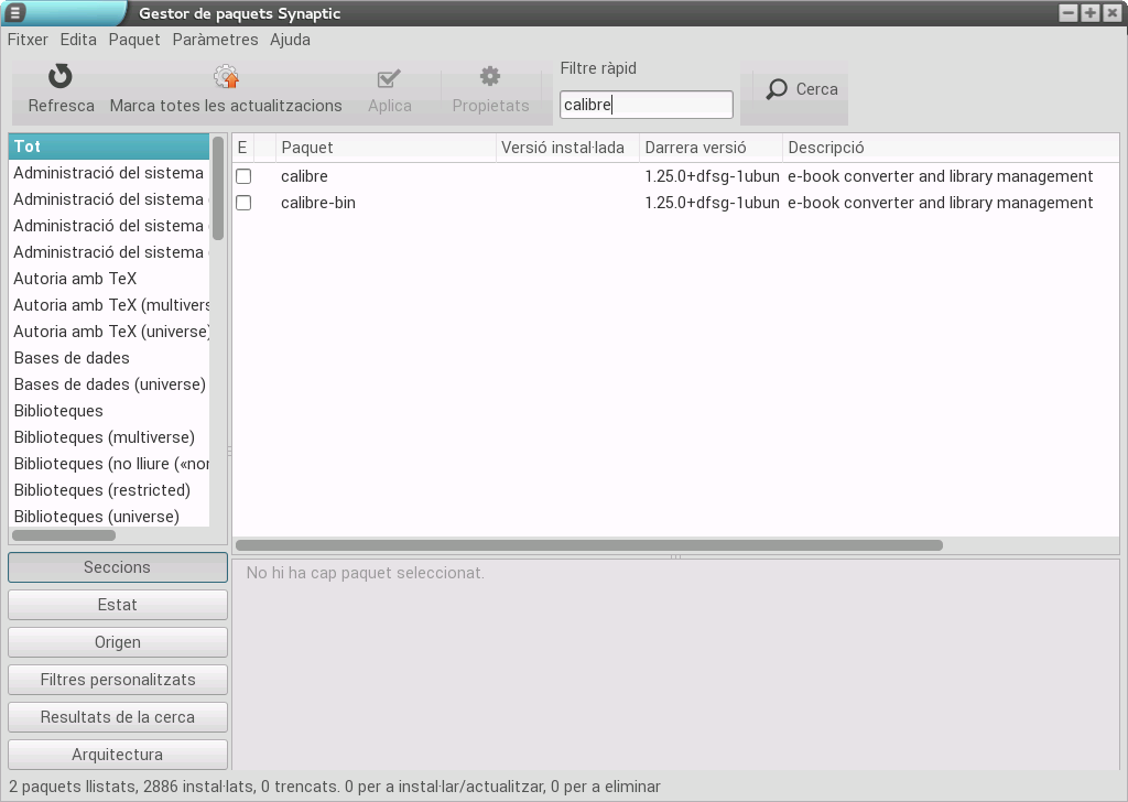 • Una part inferior que conté informació relativa al nombre de paquets llistats, instal·lats, trencats, preparats per a instal·lar/actualitzar i preparats per a desinstal·lar.