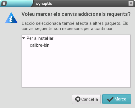 Després de seleccionar-la, és possible que el paquet depenga (requerisca) d'altres paquets. En aquest cas es mostra una finestra que indica les dependències i en la qual hem de polsar el botó Marca.