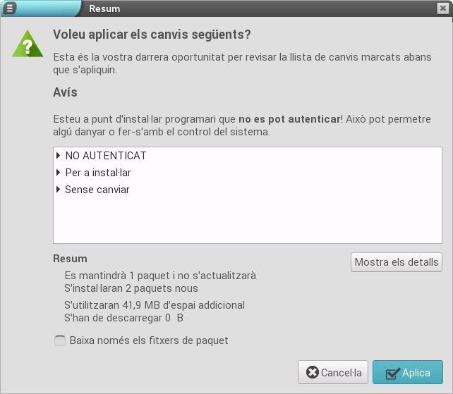 És aleshores quan els paquets canvien l'estat (es mostra com a seleccionat). Ara hem d'aplicar els canvis (perquè realitze la instal·lació) mitjançant el botó Aplica (de la barra d'eines superior), això fa que es mostre un diàleg amb els paquets que s'instal·laran/actualitzaran, així com l'espai que ocupen.
