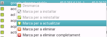 Com hem comentat en la introducció, els repositoris contenen les últimes versions dels programes, per la qual cosa en cas d'haver-hi una actualització es puja directament, de manera que queda disponibles per a tota la comunitat. Per això, pot ocórrer que algun dels programes indique que té una actualització (estat en verd amb un símbol d'exclamació). Per a actualitzar-lo, hem de seleccionar el paquet, fer clic amb el botó dret del ratolí i selecionar l'opció Marca per a actualitzar.
