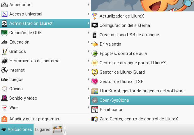 En un principio todo viene instalado por defecto en los servidores de LliureX, por lo que podemos acceder a la aplicación a través del menú: Aplicaciones -> Administración LliureX -> Open-SysClone.