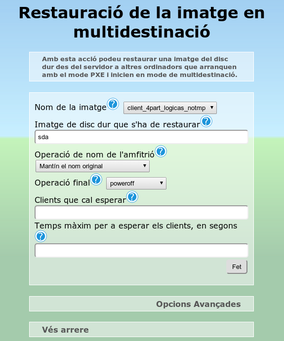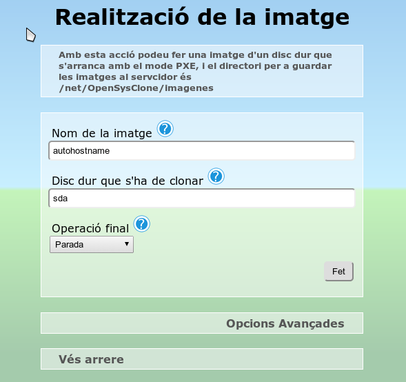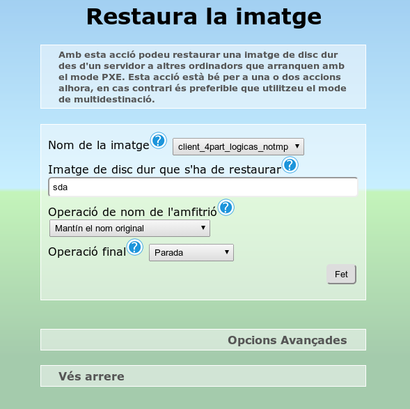 Una vegada configurades les opcions, polsem el botó Fet, amb la qual cosa tindrem el servidor preparat per a proporcionar la imatge als equips on vulguem bolcar-la. En aquest cas es realitzarà de manera individual perquè si posem diversos equips al mateix temps, consumiran recursos de xarxa, d'accés al disc dur del servidor, etc., i baixarà exponencialment la velocitat de transmissió de la imatge en processos superiors a tres o quatre equips al mateix temps.