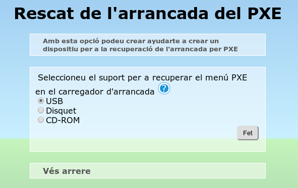 Des de LliureX hem vist que algunes màquines, que no tenen el menú GRUB del LliureX, no poden arrancar per xarxa directament des de la BIOS ni amb l'opció d'arrancada per xarxa. Per això, hi ha l'opció Recuperació de l'arrancada PXE que ens facilita el procés mitjançant la creació, a través de diversos dispositius, de ferramentes que ens permetran l'arrancada per xarxa i la càrrega del menú PXE.