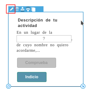 Para configurar la actividad se hará clic sobre la opción de editar de su barra de herramientas mostrándose un cuadro de diálogo para introducir el título de la actividad y el texto de la misma. Para ocultar una palabra se seleccionará las misma y se hará clic sobre el botón correspondiente (1), quedando la palabra remarcado en rojo. Hay que tener cuidado ya que si se selecciona una coma o un espacio la actividad esperara que se ponga también esa coma o ese espacio.